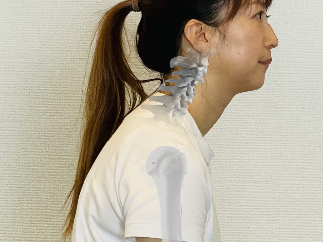 首の問題は首単体ではなく、肩甲骨の可動性や腕の使い方とも深く関係しています。肩甲骨が外側に固定される巻き肩姿勢では、胸椎1番の動きが低下し、結果的に頸椎6・7番の可動に偏りが生じます。