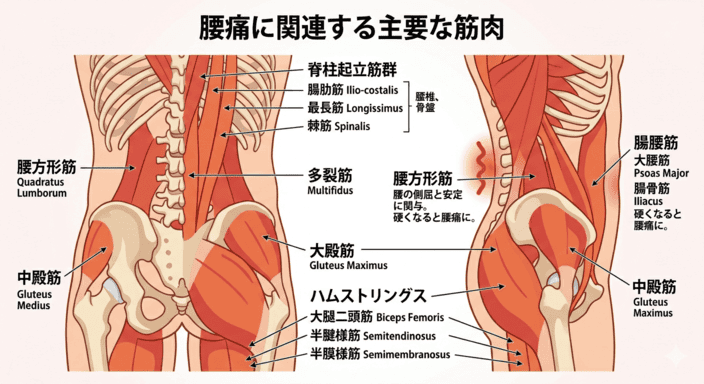 ここがズレると、腰の中央の張り感、前かがみでの痛み、姿勢保持のつらさが出やすくなります。
