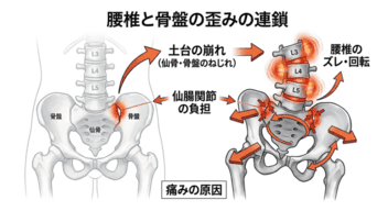 この仙骨がねじれると、骨盤全体のバランスが崩れ、腰椎にもズレや負担が出やすくなります。